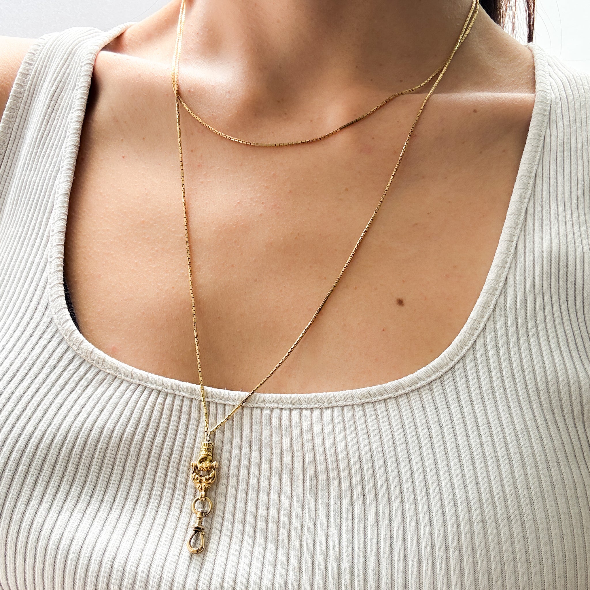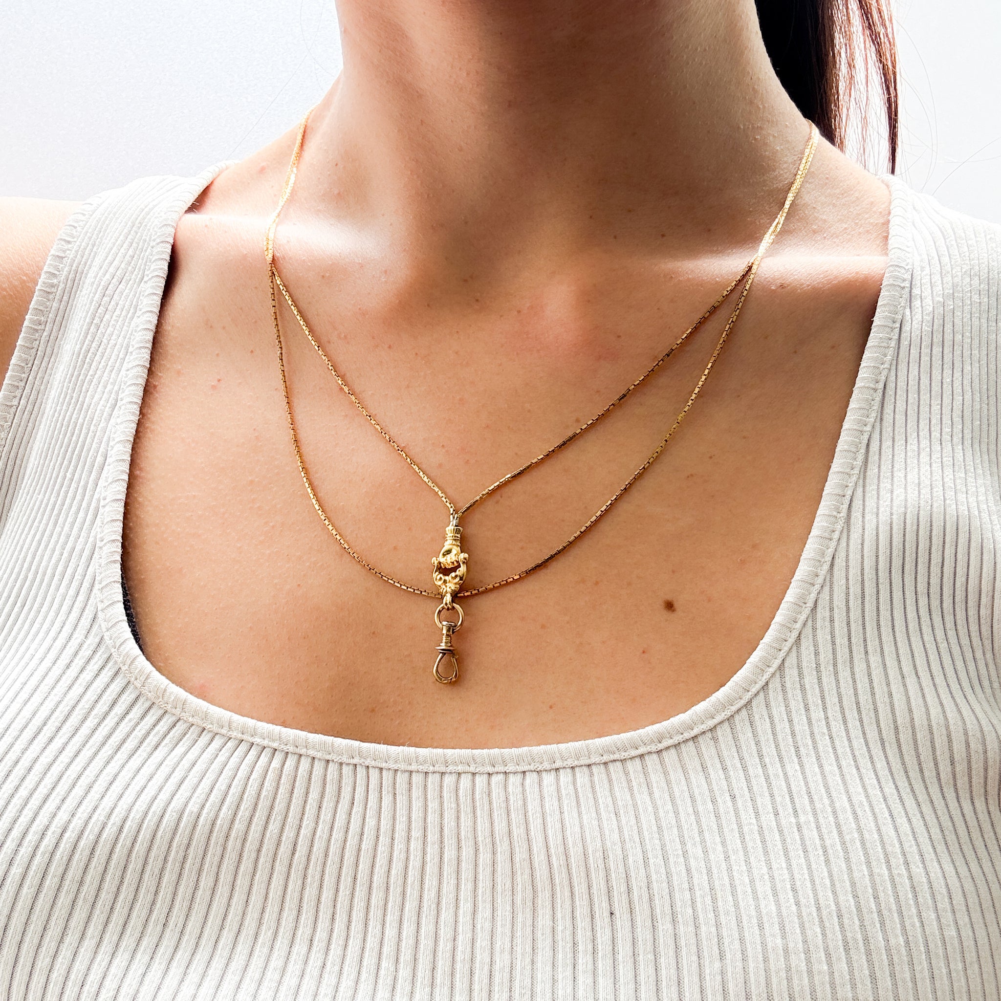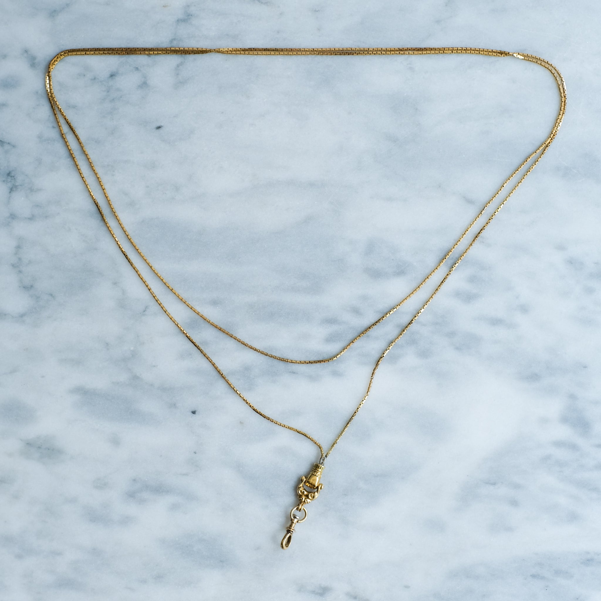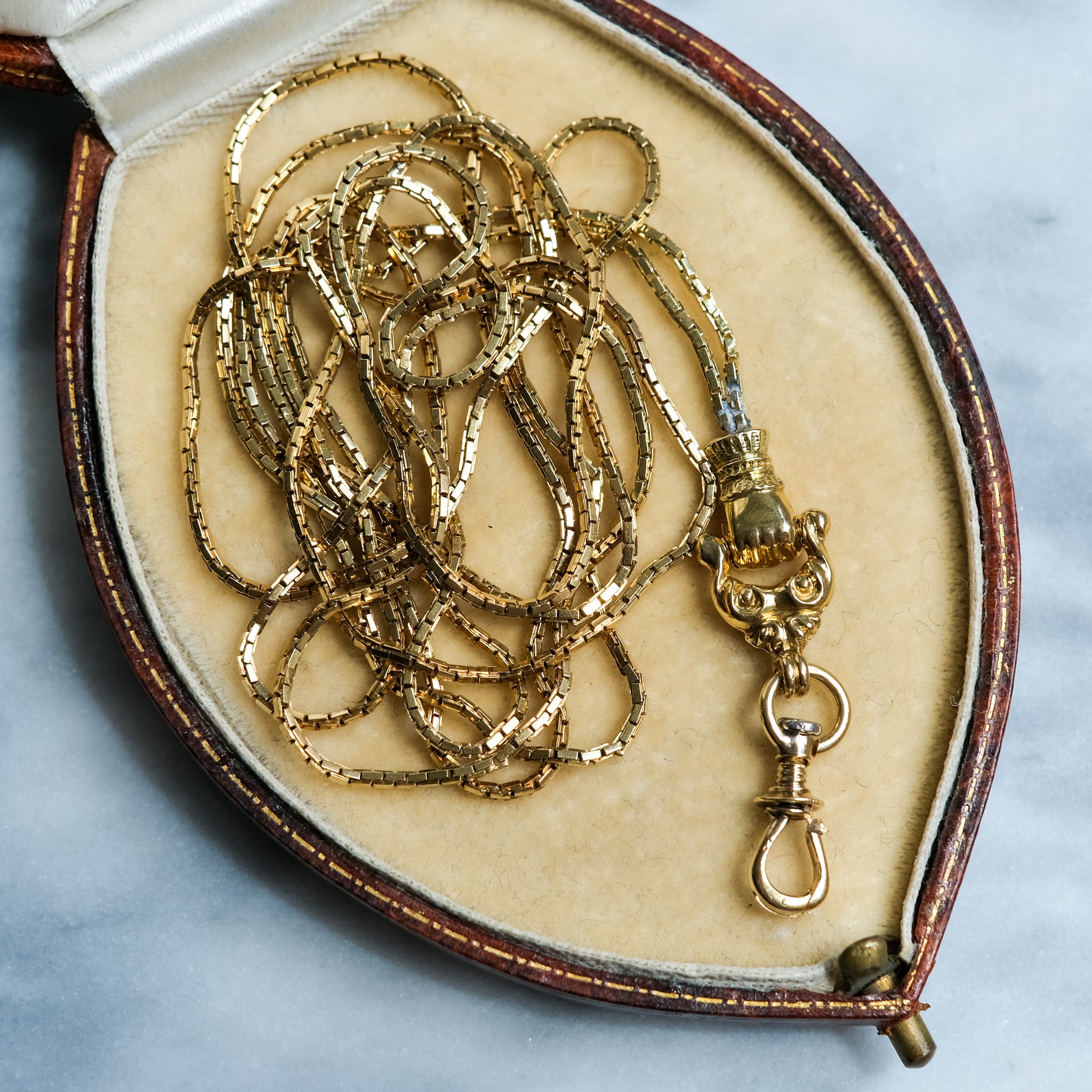 An exquisite Victorian-era French long guard chain crafted in 18K yellow gold, complete with a gloved hand clasp and a screw-on dog clip.