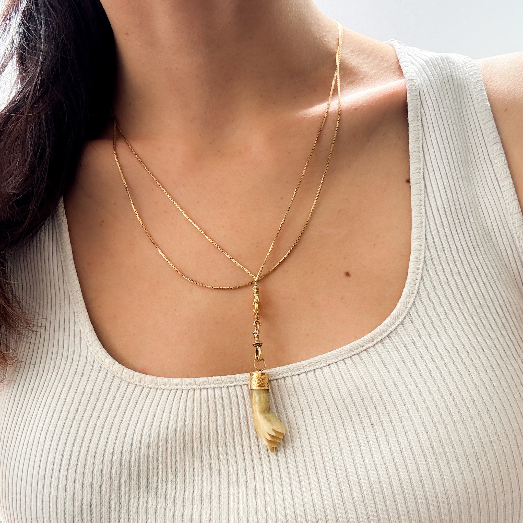 Its sinuous snake-link design leads gracefully to the detailed hand clasp, which holds a stirrup connected to the dog clip. Wonderfully versatile, the chain can be styled with the hand clasp at the front, or worn with the slider forward for a bolder look. It may be doubled, or fastened at one end for varied lengths and silhouettes.