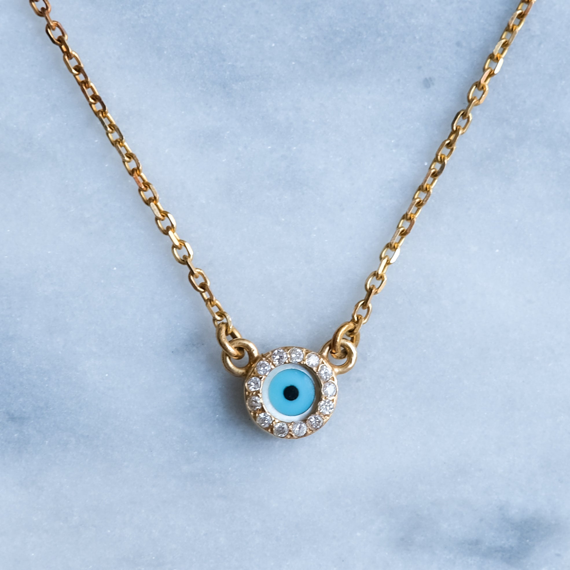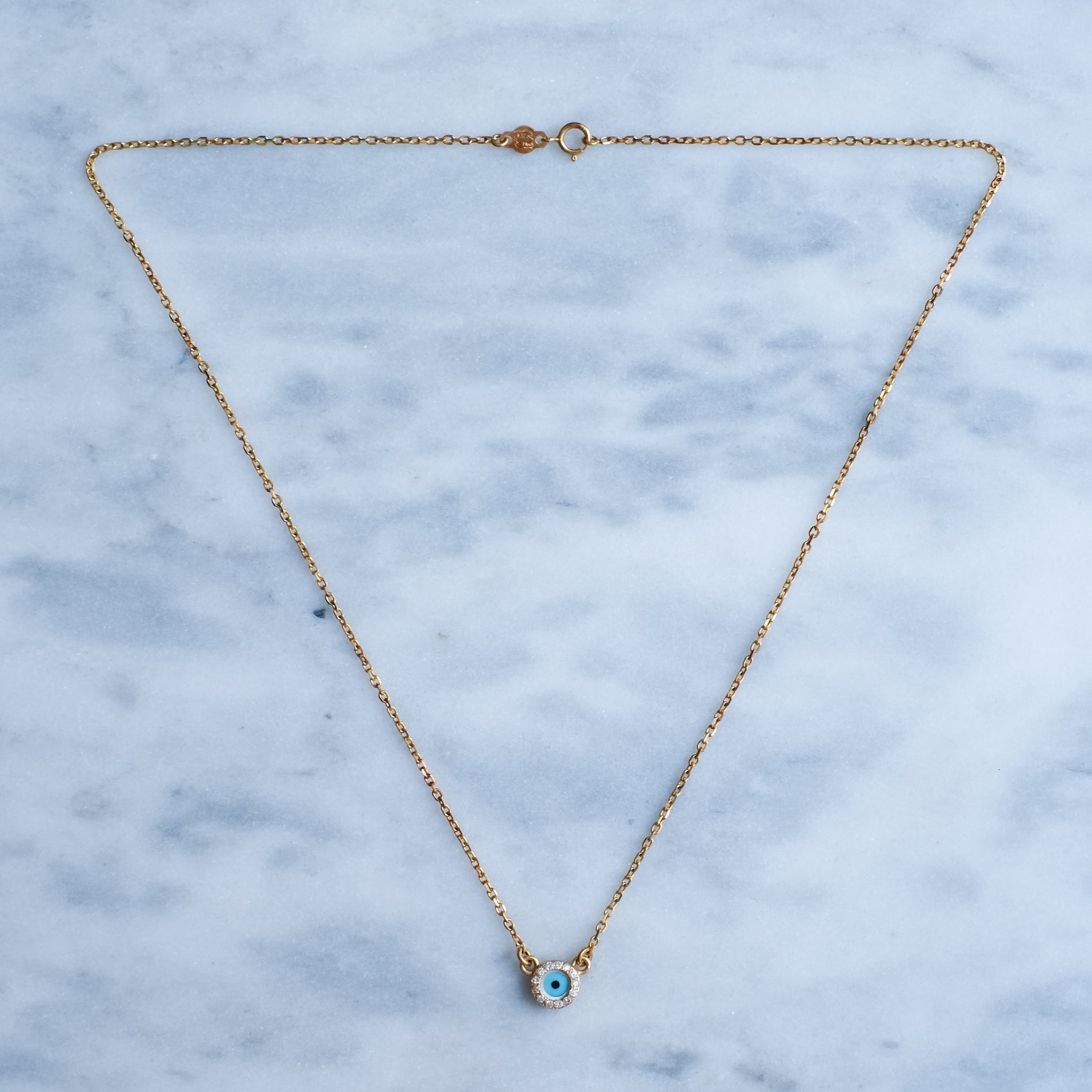 A 16-inch cable-link chain crafted in rich 18K yellow gold featuring a mother of pearl evil eye pendant, one side collet set with diamonds for light and sparkle while the other side is claw-set.
