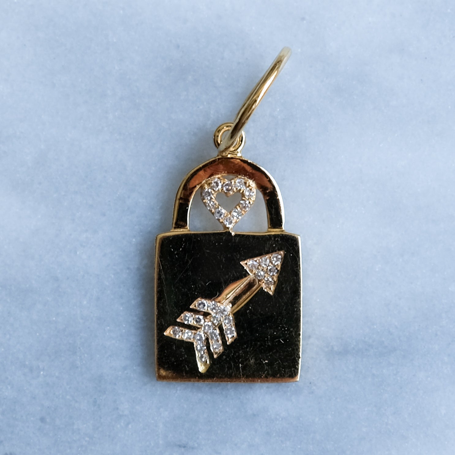 This stunning vintage pendant, fashioned in luxurious 14K yellow gold, resembles a charming miniature locket, exuding both elegance and allure. The arrow sparkles with pavé-set single-cut diamonds, topped with a delicate heart also adorned in pavé-set single-cut diamonds.