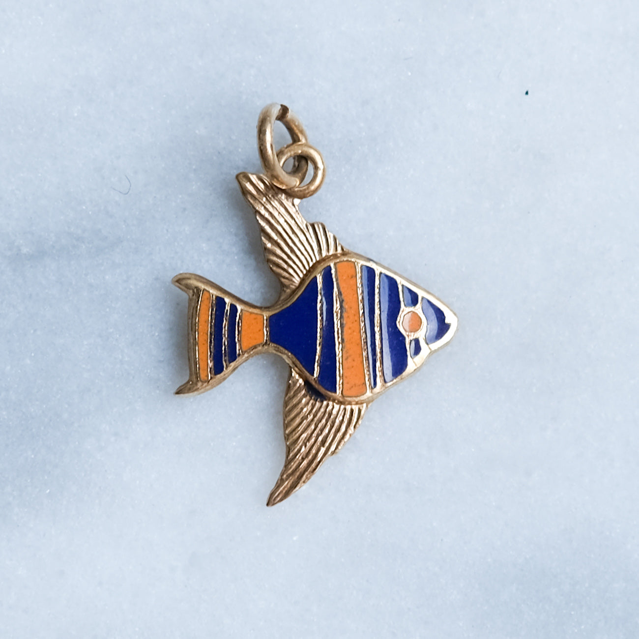 A playful 14K solid gold heart pendant showcasing an angelfish rendered in vibrant blue and orange striped enamel. The lively burst of colour adds a cheerful touch of whimsy to any pendant jumble. In many cultures, fish symbolize abundance, harmony, and good fortune — making this little treasure not only eye-catching but also rich in meaning.