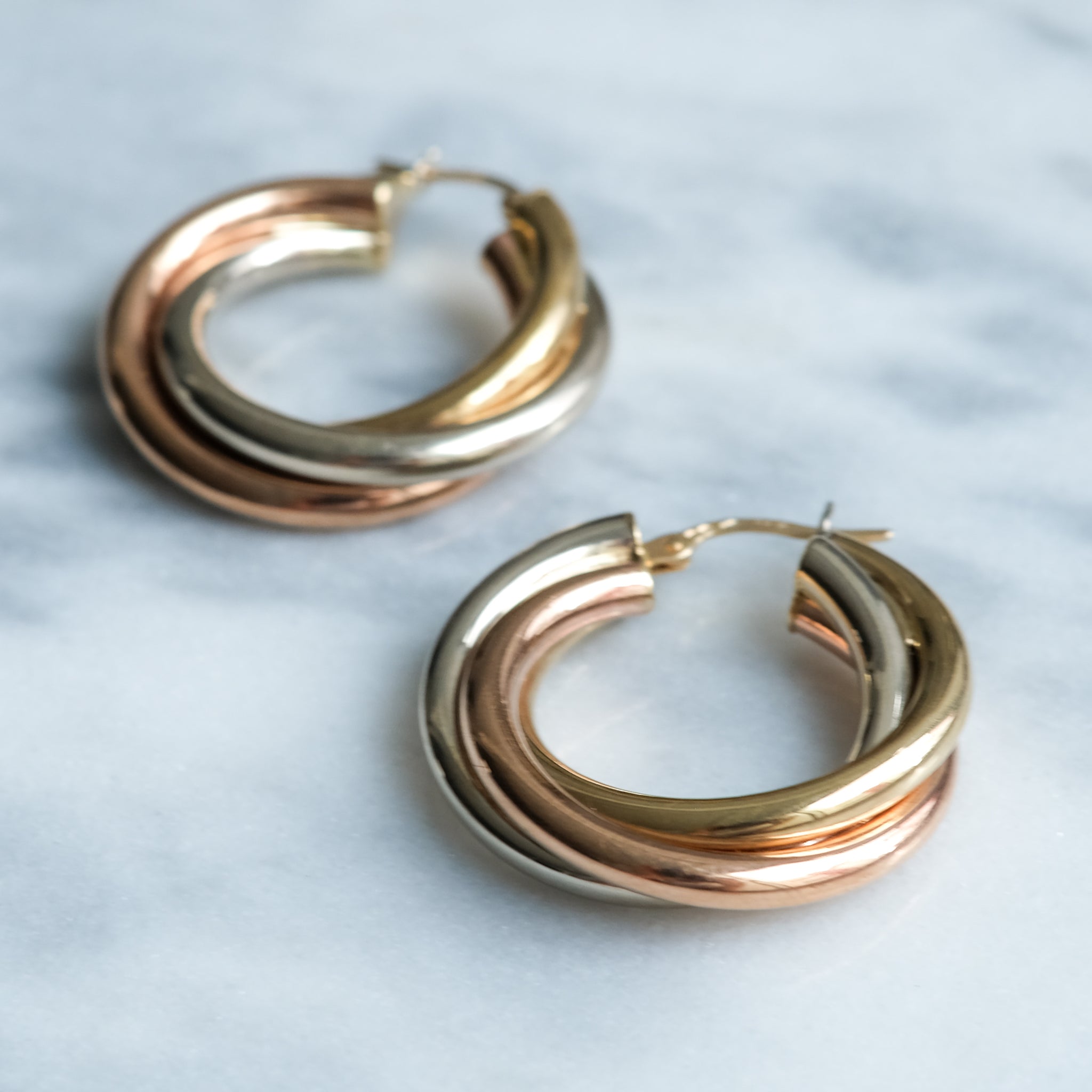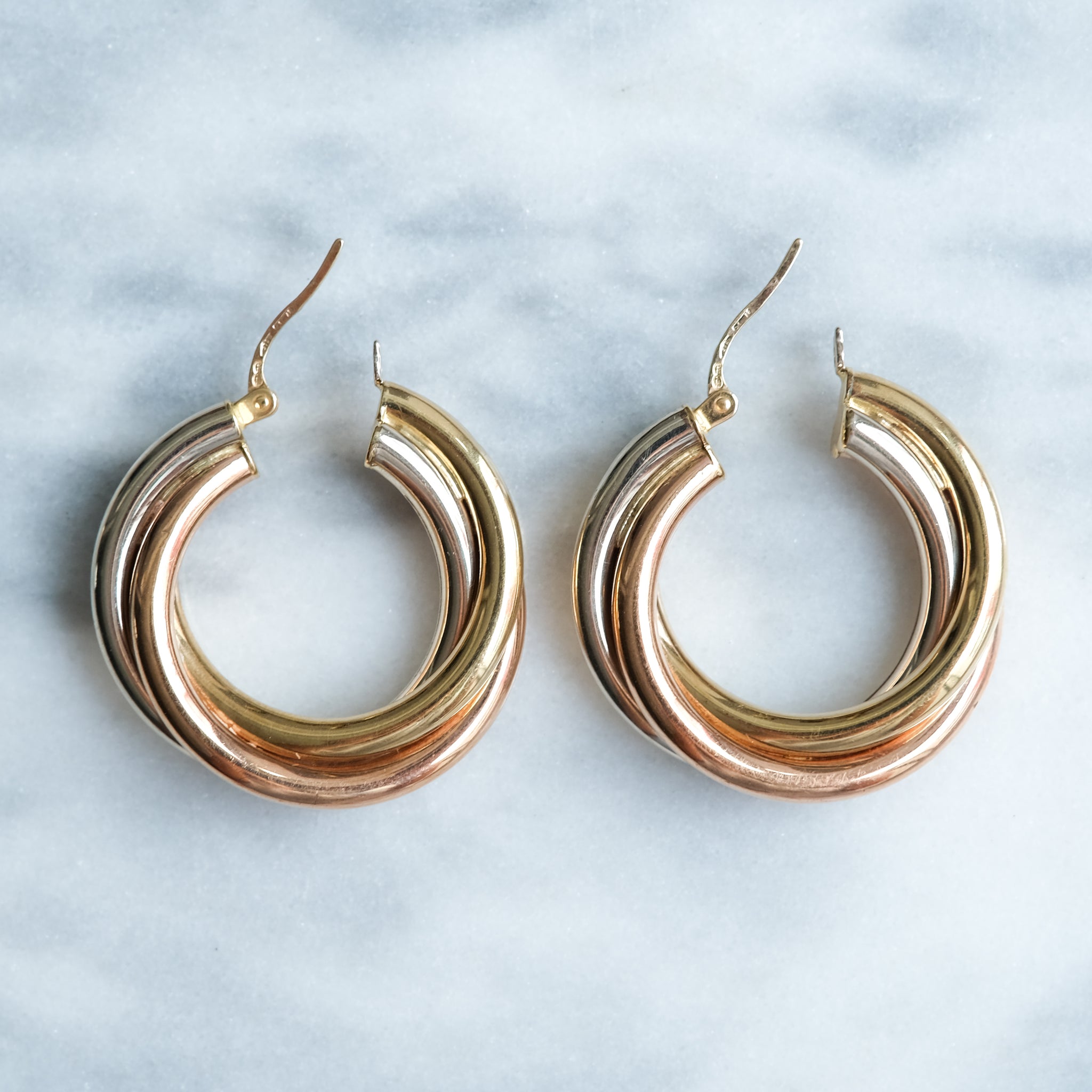 A chic pair of modern round twist hoop earrings crafted in 9K yellow, white, and rose gold, their intertwined design creating a subtle tricolour shimmer. Lightweight and easy to wear, they bring effortless elegance to your everyday look. Finished with secure latch-back closures in excellent condition, these versatile hoops are a timeless staple you’ll reach for time and again.”