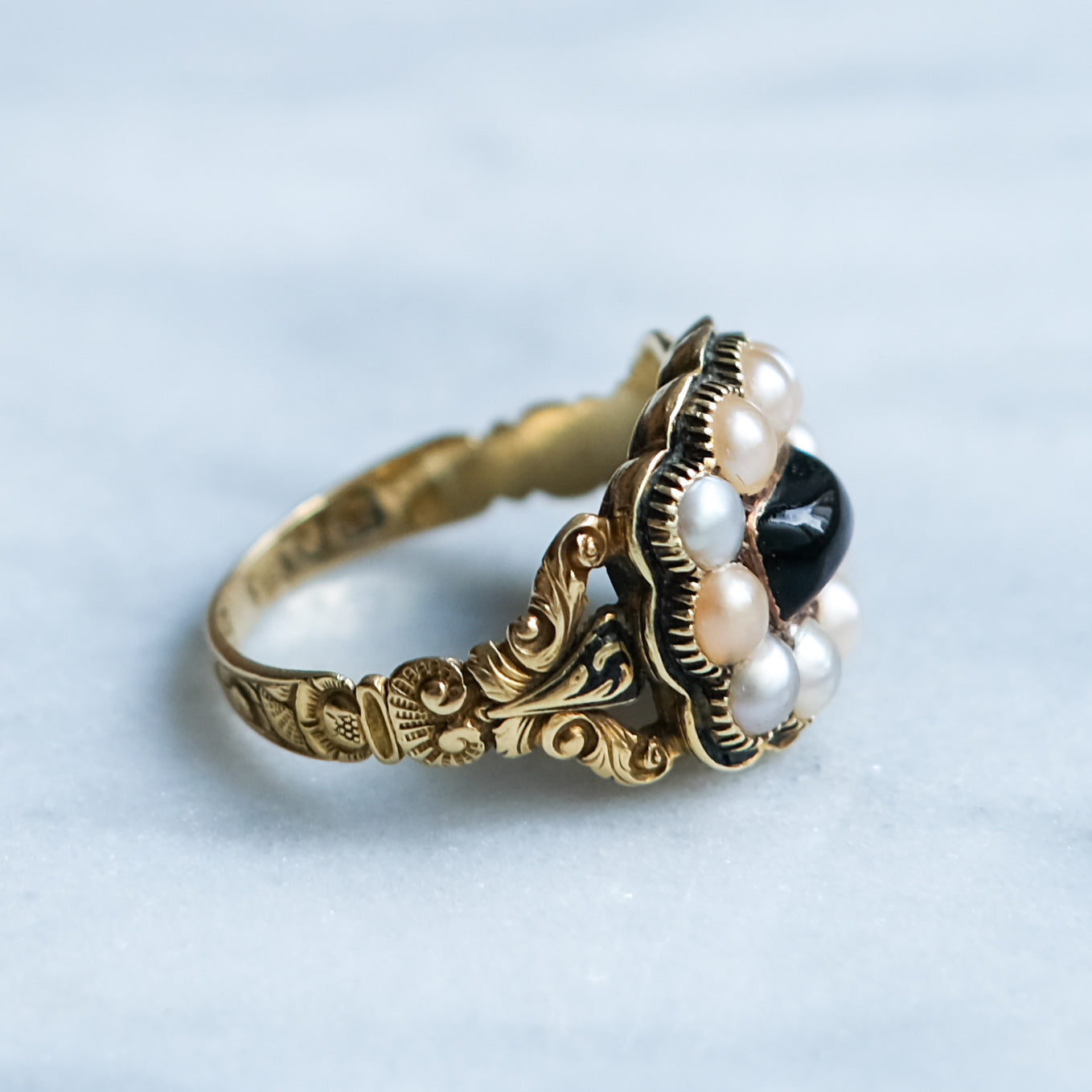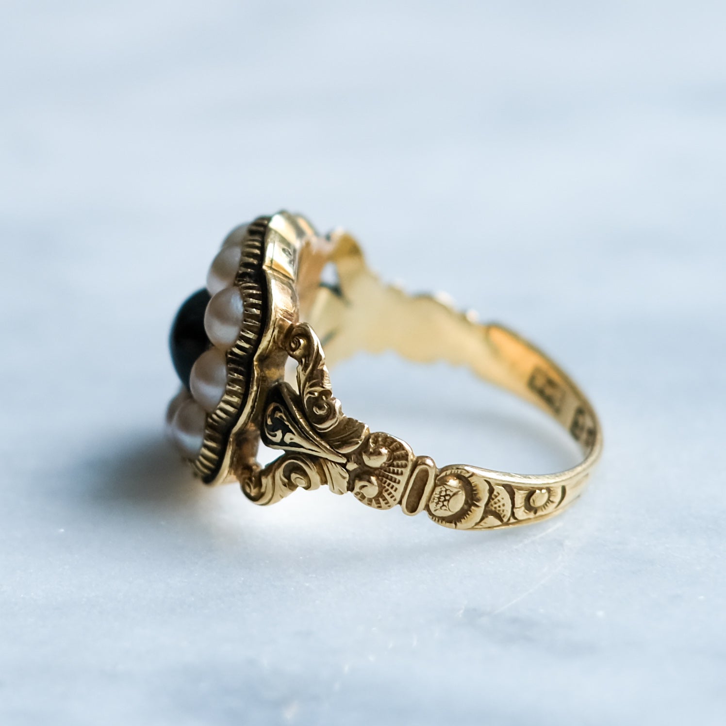 A striking antique Georgian era ring crafted in 18K yellow gold, centered on a sleek rectangular cabochon-cut onyx encircled by a halo of collet-set pearls, all framed by rich black enamel for a dramatic contrast. The gallery is flanked by ornately chased split shoulders, adorned with delicate floral and foliate motifs.
