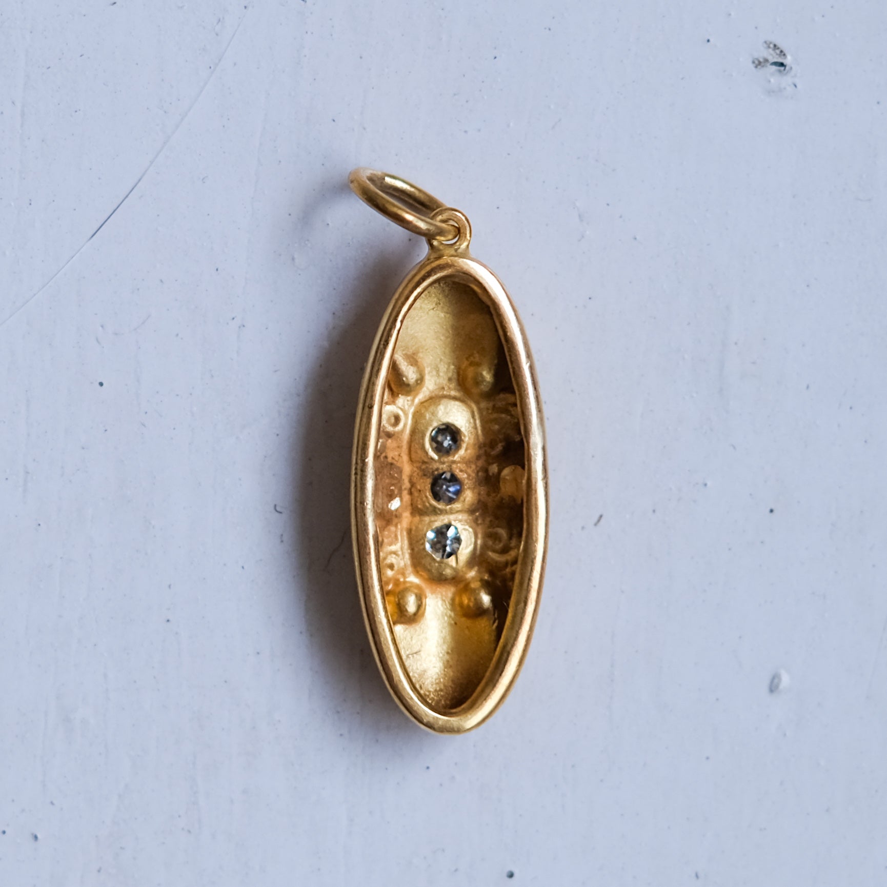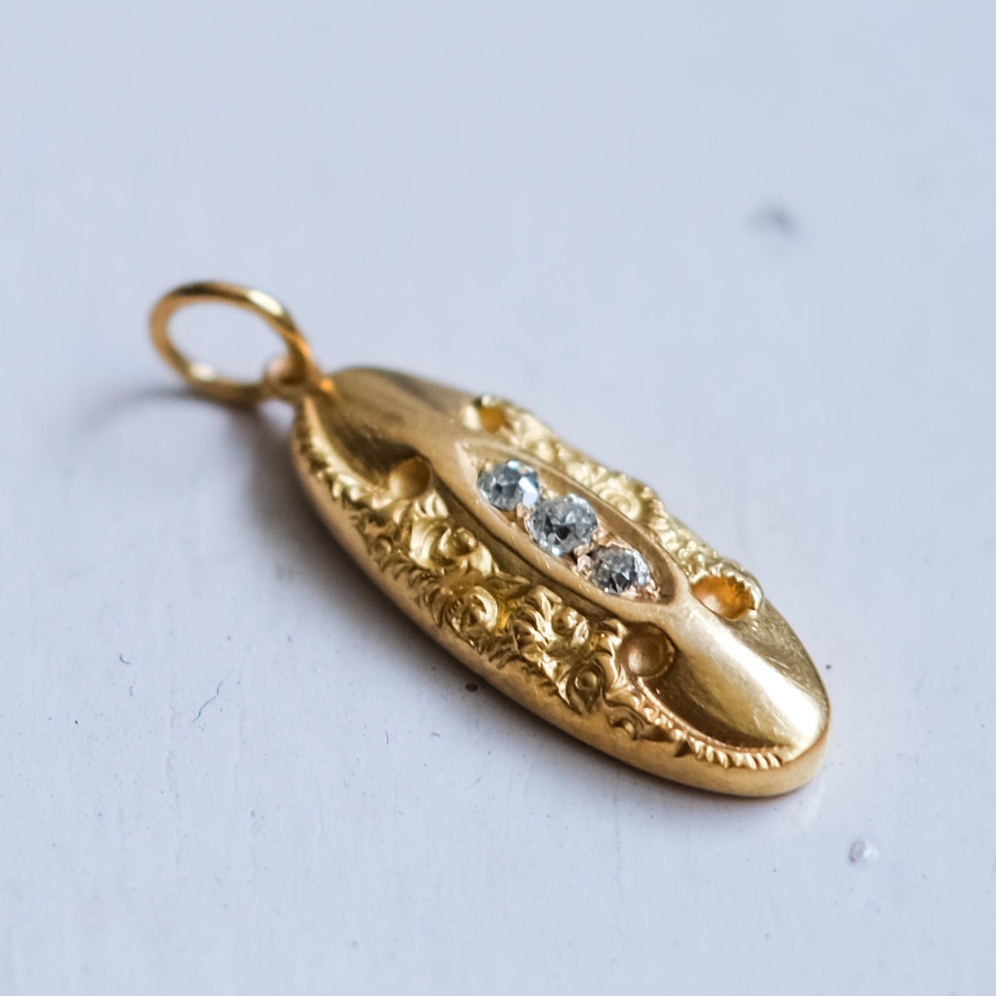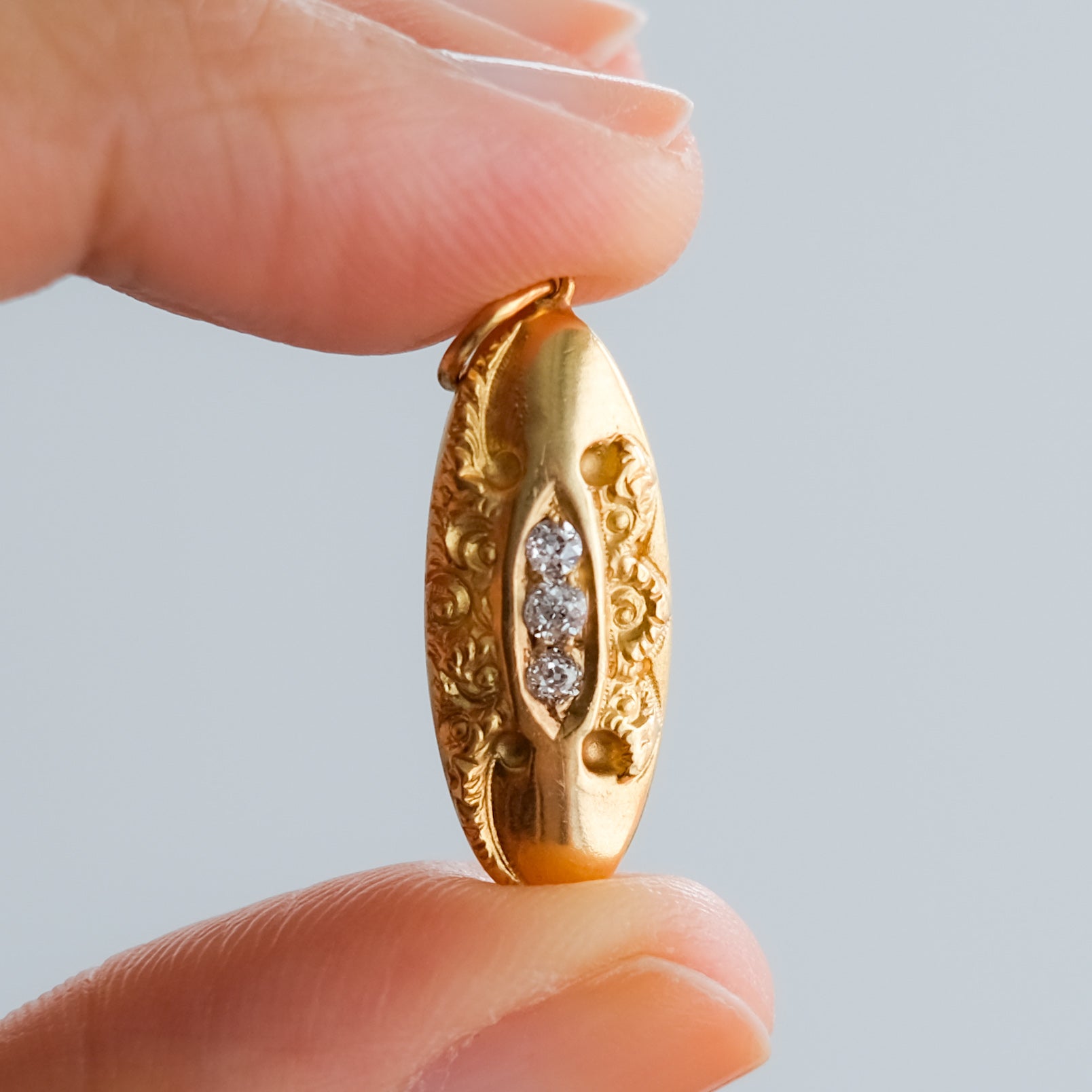 A charming pendant of elongated oval form, featuring a repoussé floral design. This piece is a conversion jewel, cufflinks reimagined as pendants, centred with three old mine cut diamond in a navette mount set into the panel and is crafted in 18K yellow gold. Dating to the Victorian era, it beautifully reflects the delicate craftsmanship and romantic motifs characteristic of the period.