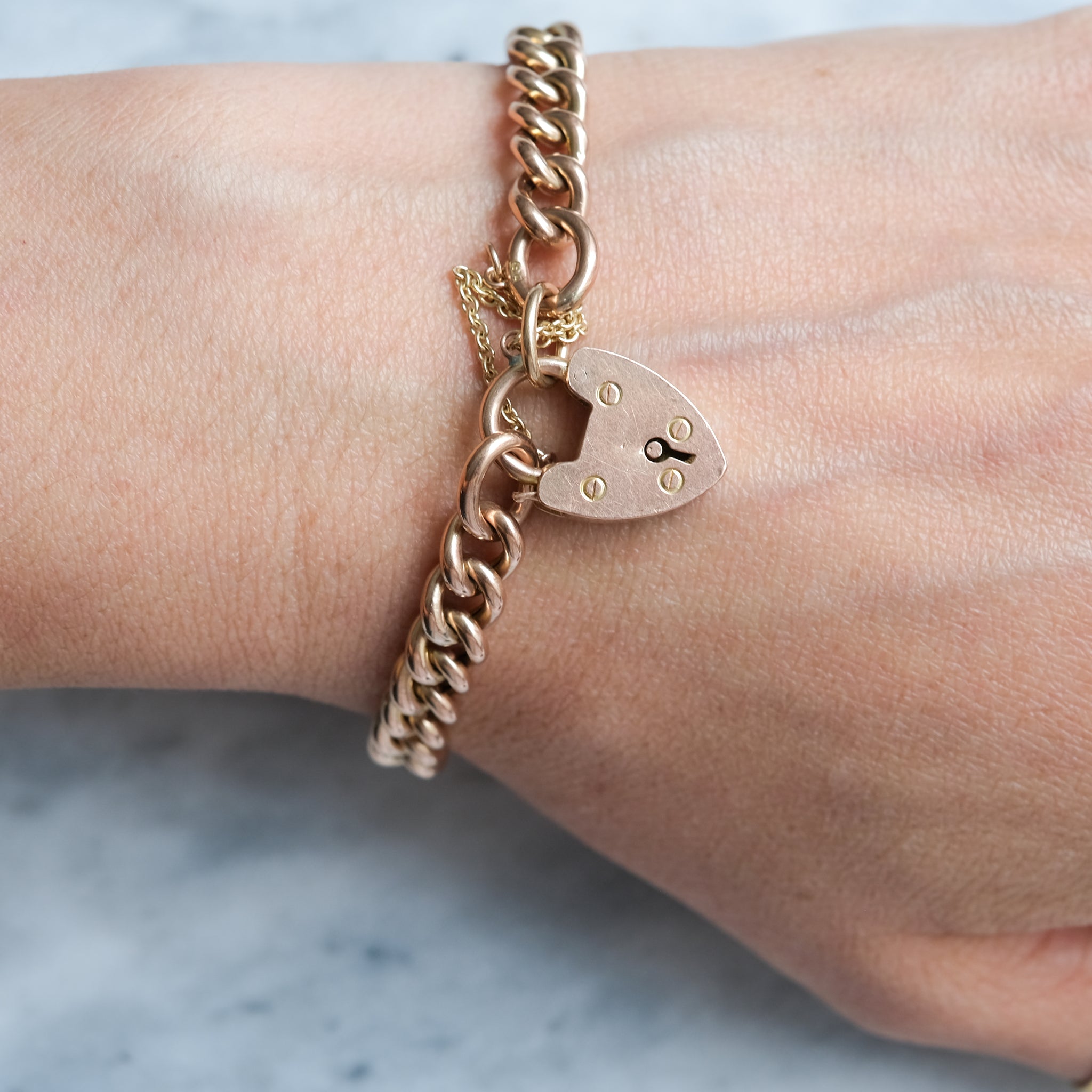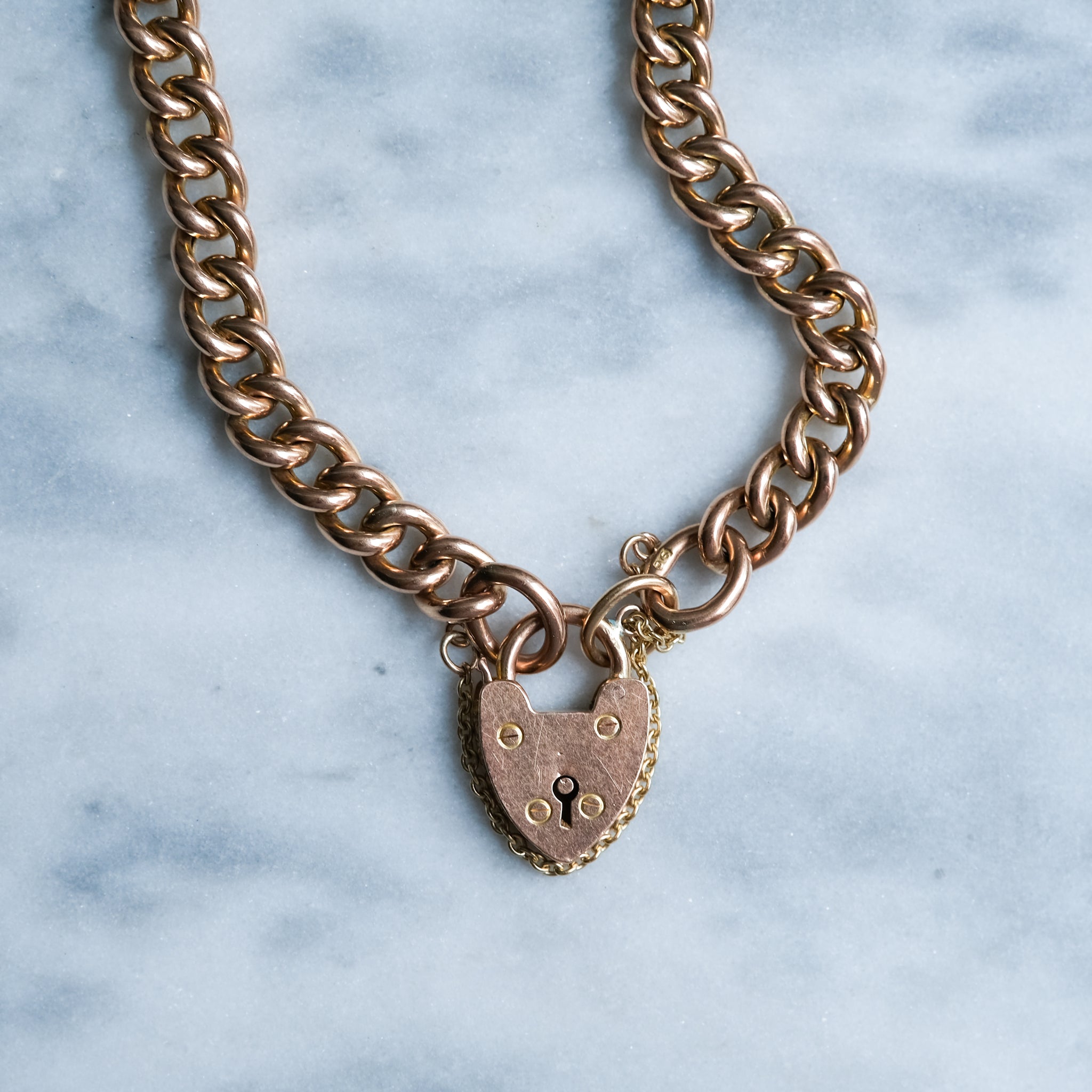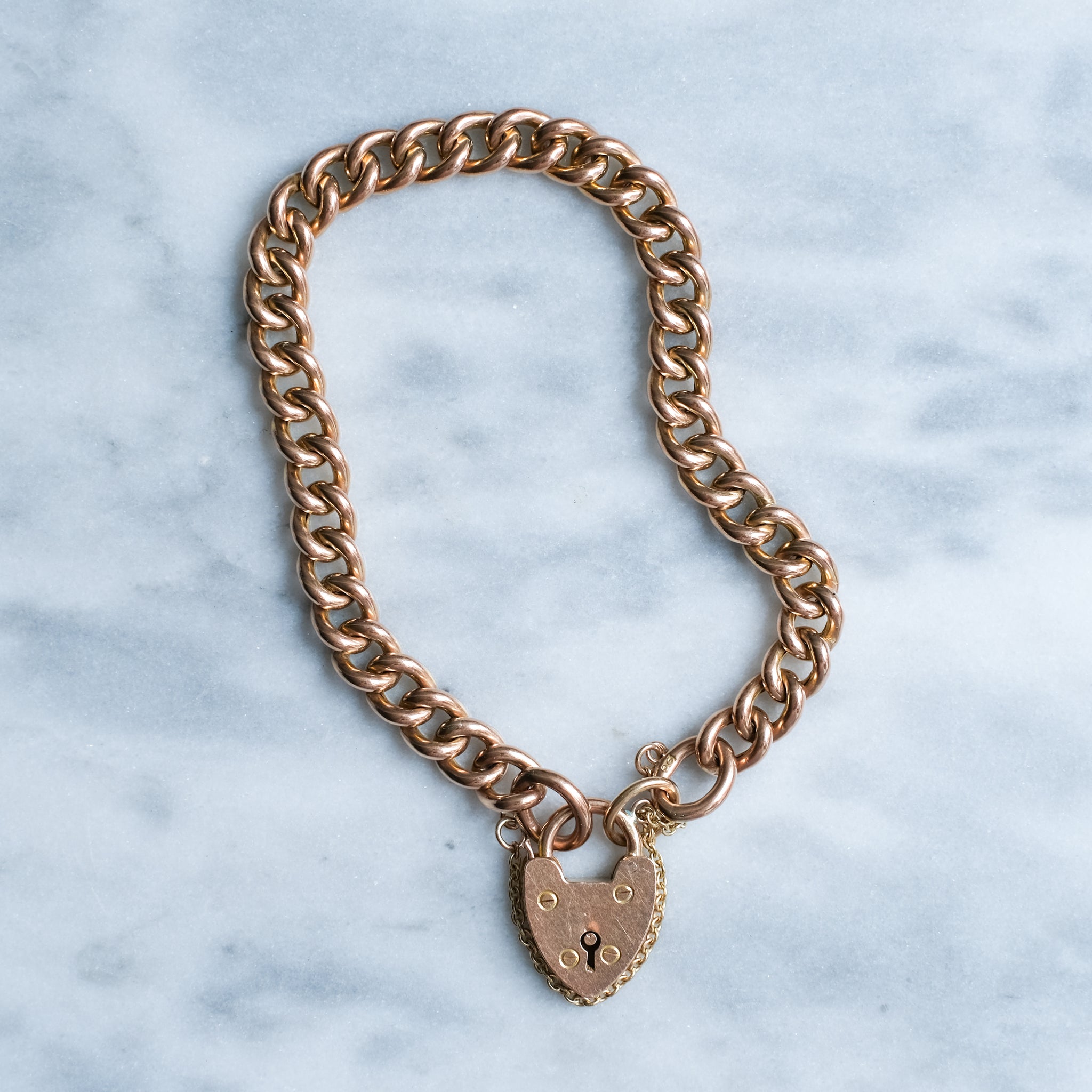 A 7-7.25 inch vintage curb-link bracelet crafted out of 9K Rose Gold. It adds a nice and chunky presence in your wrist stack and will be perfect to hold your collection of charms.