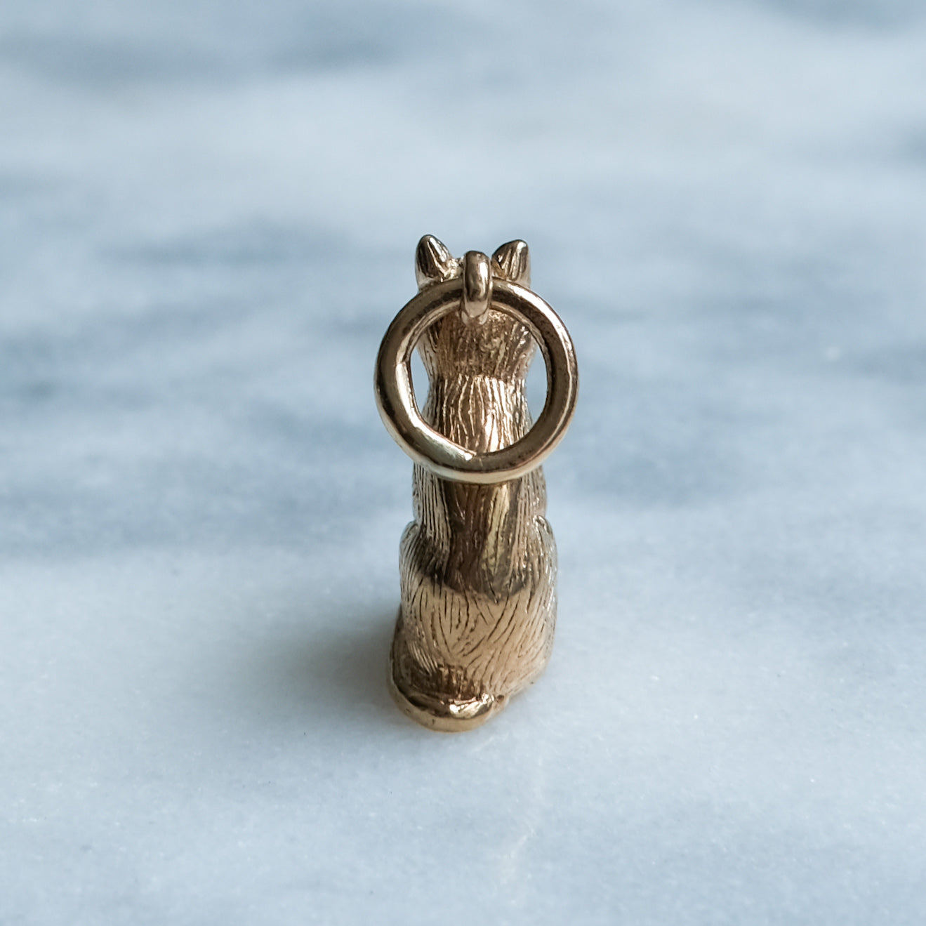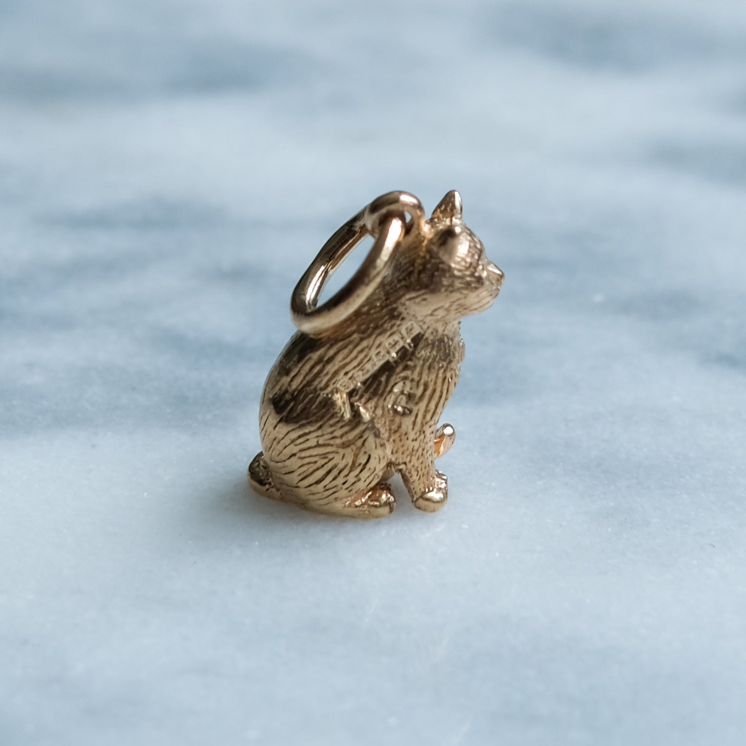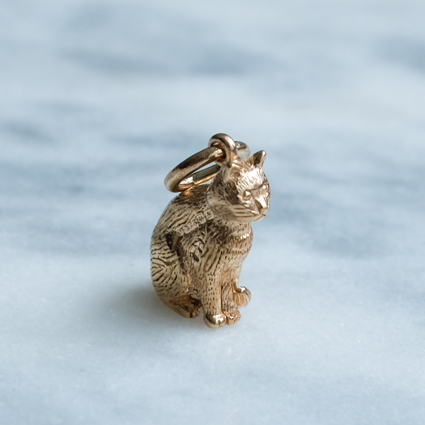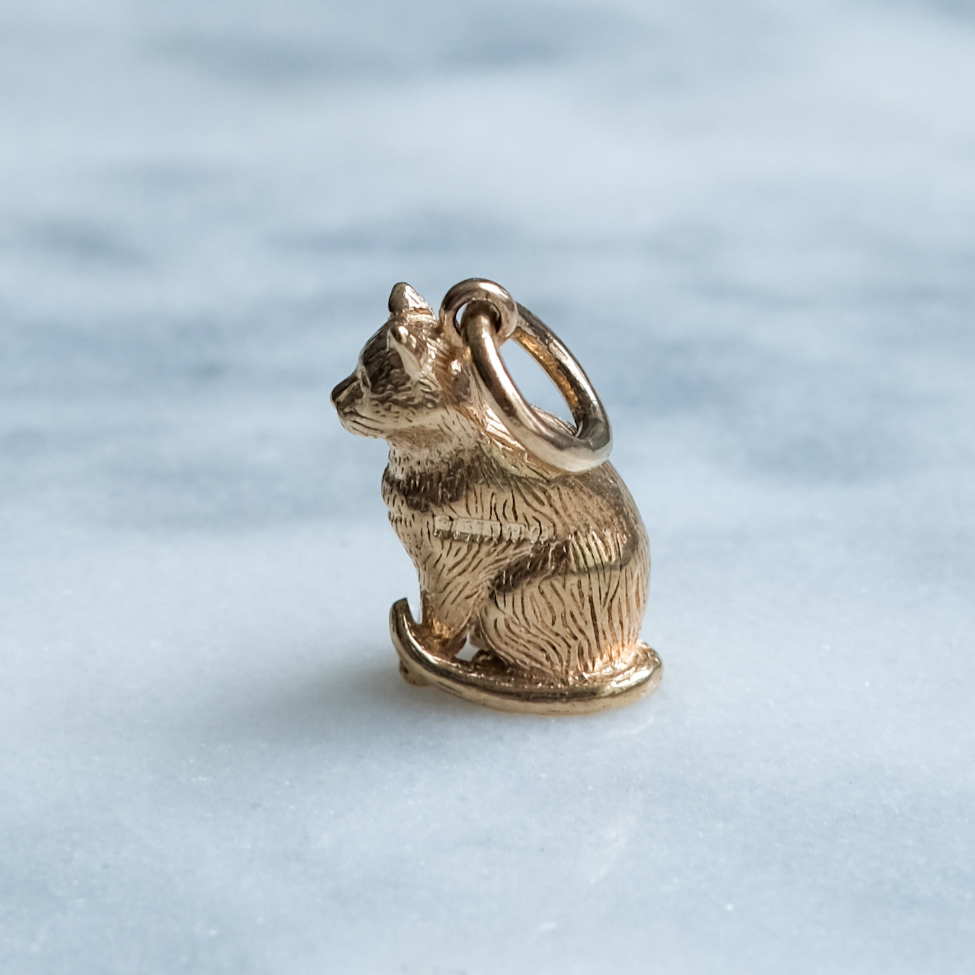 A charming vintage sitting cat charm/pendant crafted in 9K yellow gold. The cat is captured in a demure pose, tail curled neatly at its side, with a sweet expression that brings it to life. Playful yet elegant, this miniature treasure is a timeless homage to the feline form and a purr-fect addition to any charm collection.