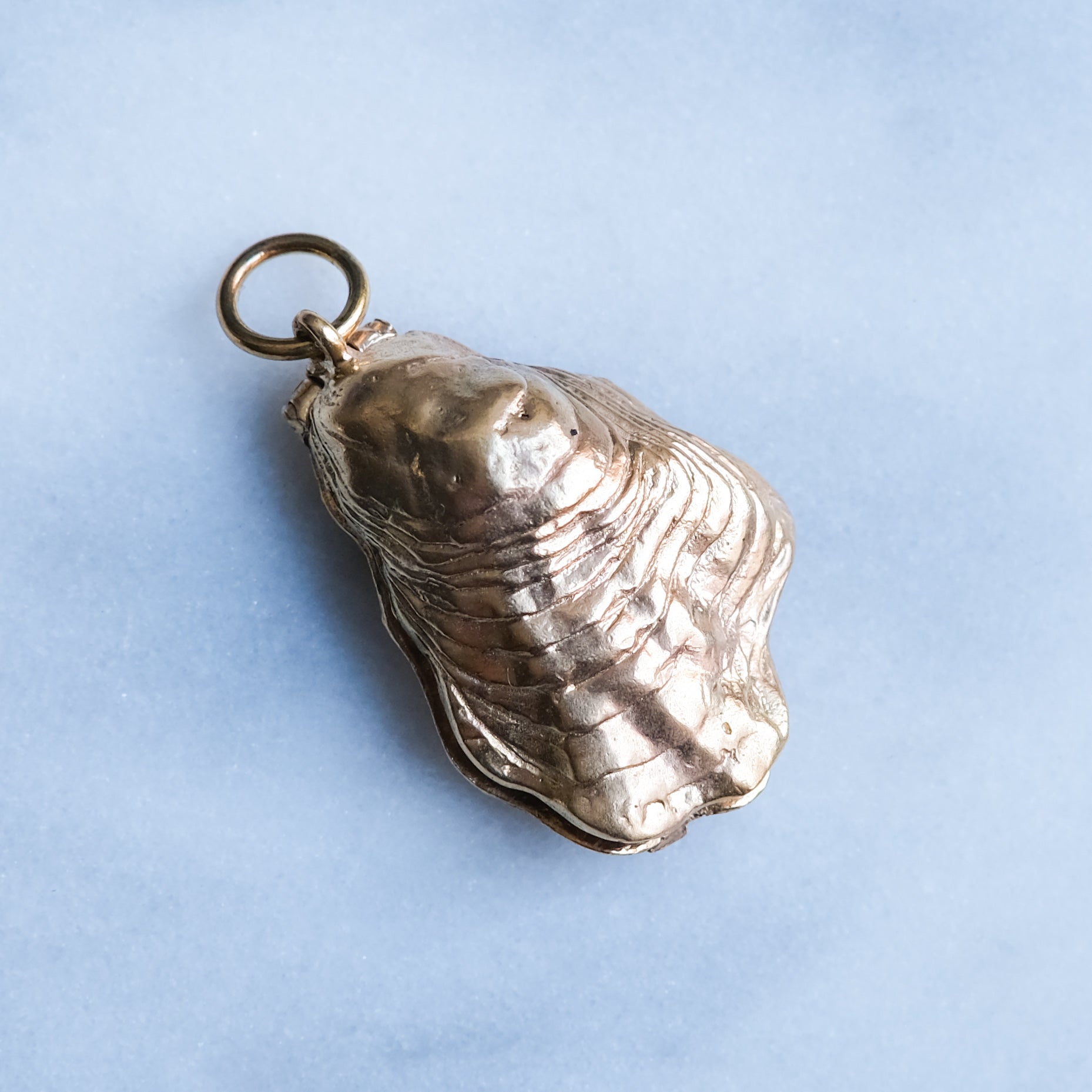 A lovely vintage oyster charm crafted in 9K yellow gold, designed to open and reveal a luminous pearl nestled within. Delightfully detailed and full of character, this charming little treasure captures the magic of a hidden surprise.