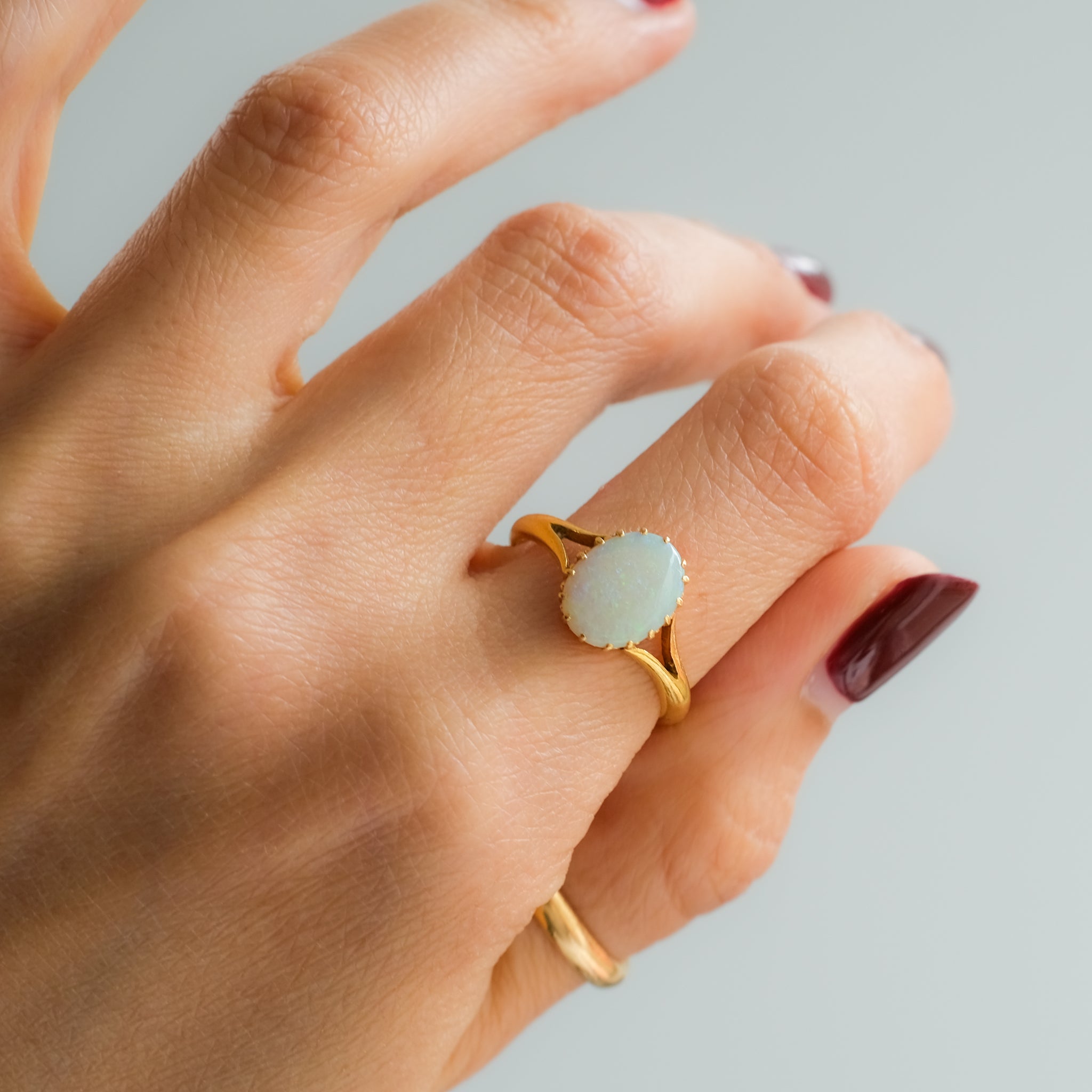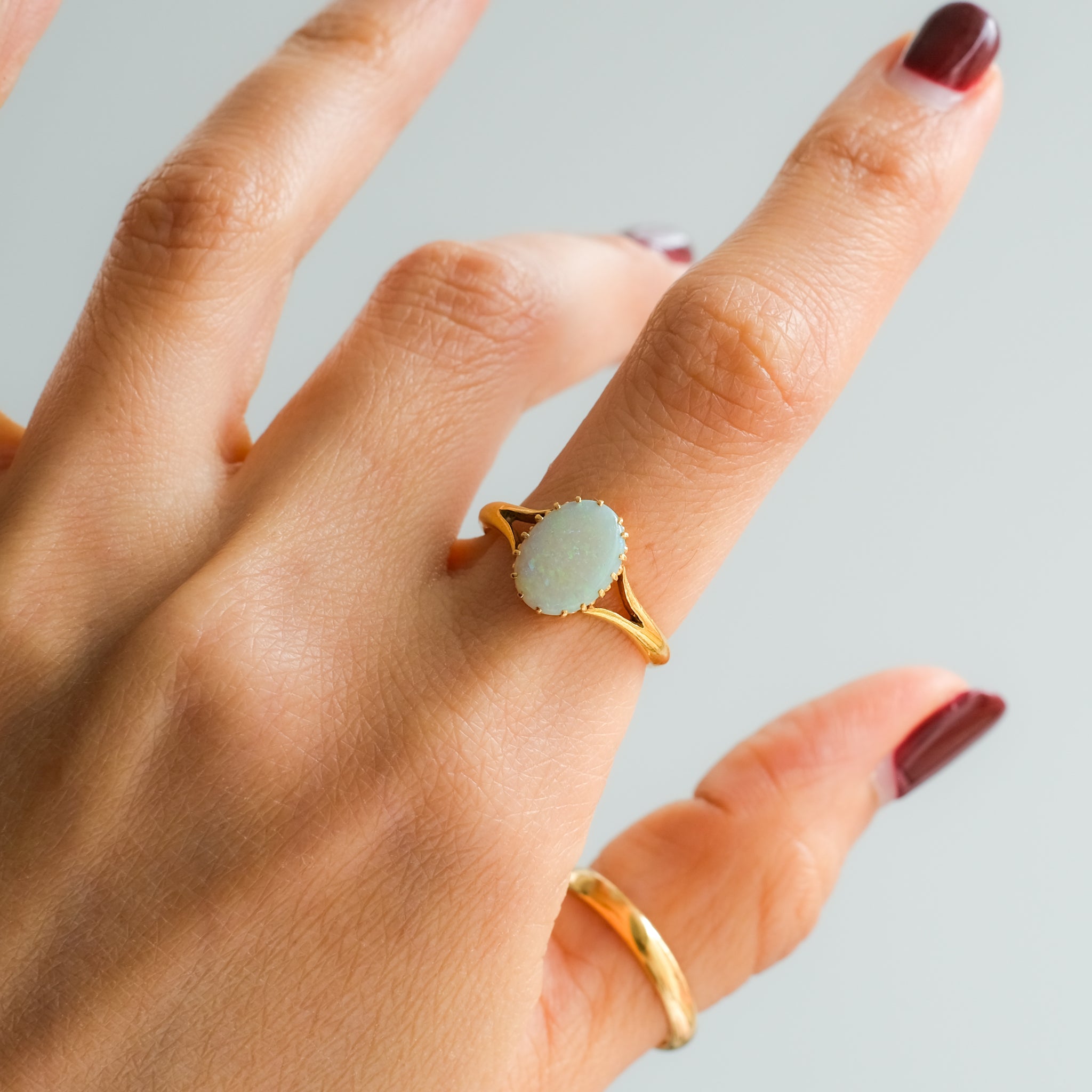 A mesmerizing antique solitaire ring crafted in 18K yellow gold, showcasing a luminous opal held securely in a delicate all-around claw setting. The shank features elegant split shoulders, drawing the eye toward the centre stone, which shimmers with flashes of green, blue, and violet that dance in the light.