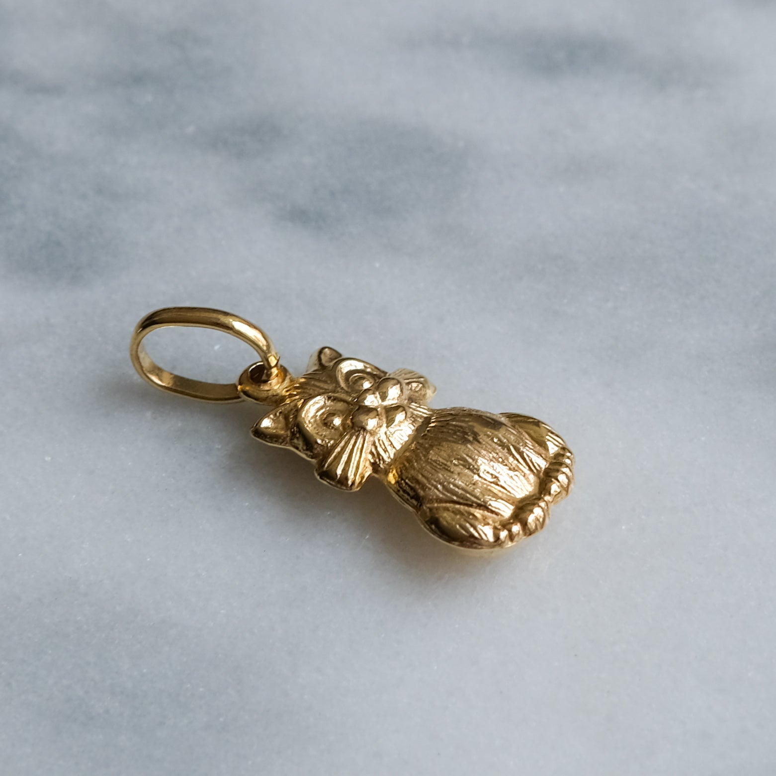 A delightful three-dimensional cat charm crafted in 9K yellow gold, captured in a playful pose that suggests it’s either up to mischief or eagerly awaiting a treat. Perfect for daily wear, it also makes a thoughtful gift for a loved one.