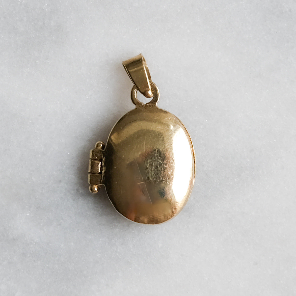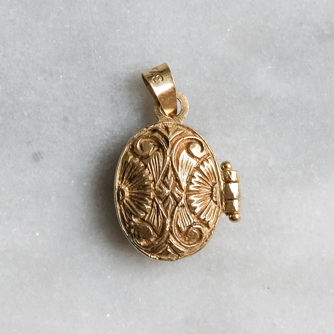 A charming tiny oval locket, beautifully crafted in 9K yellow gold, featuring a delicate embossed floral design on the front. This sweet piece opens to hold a small keepsake—perfect for carrying something close to your heart.
