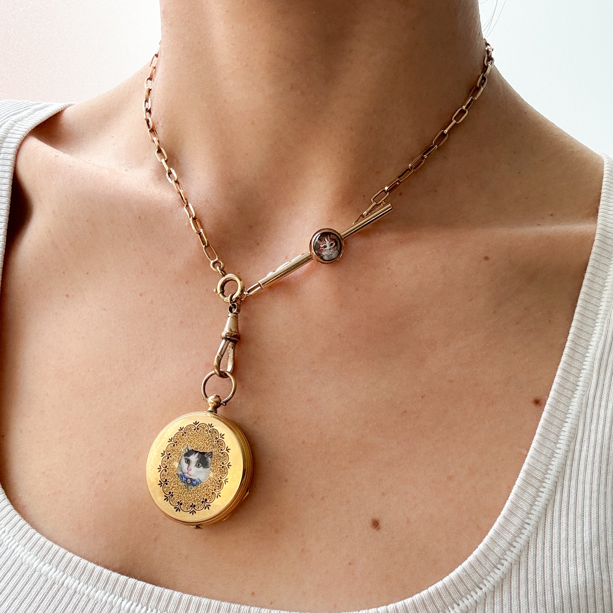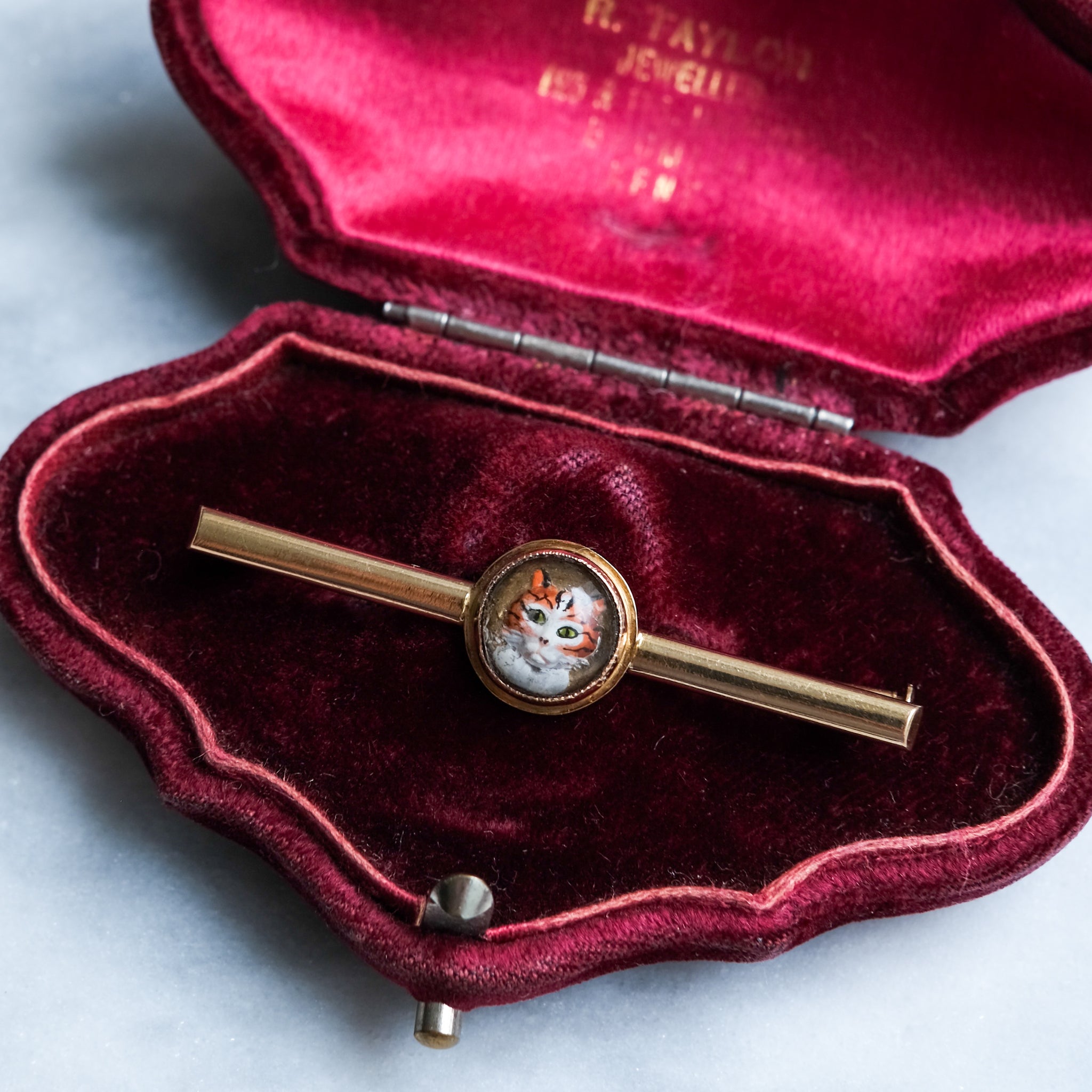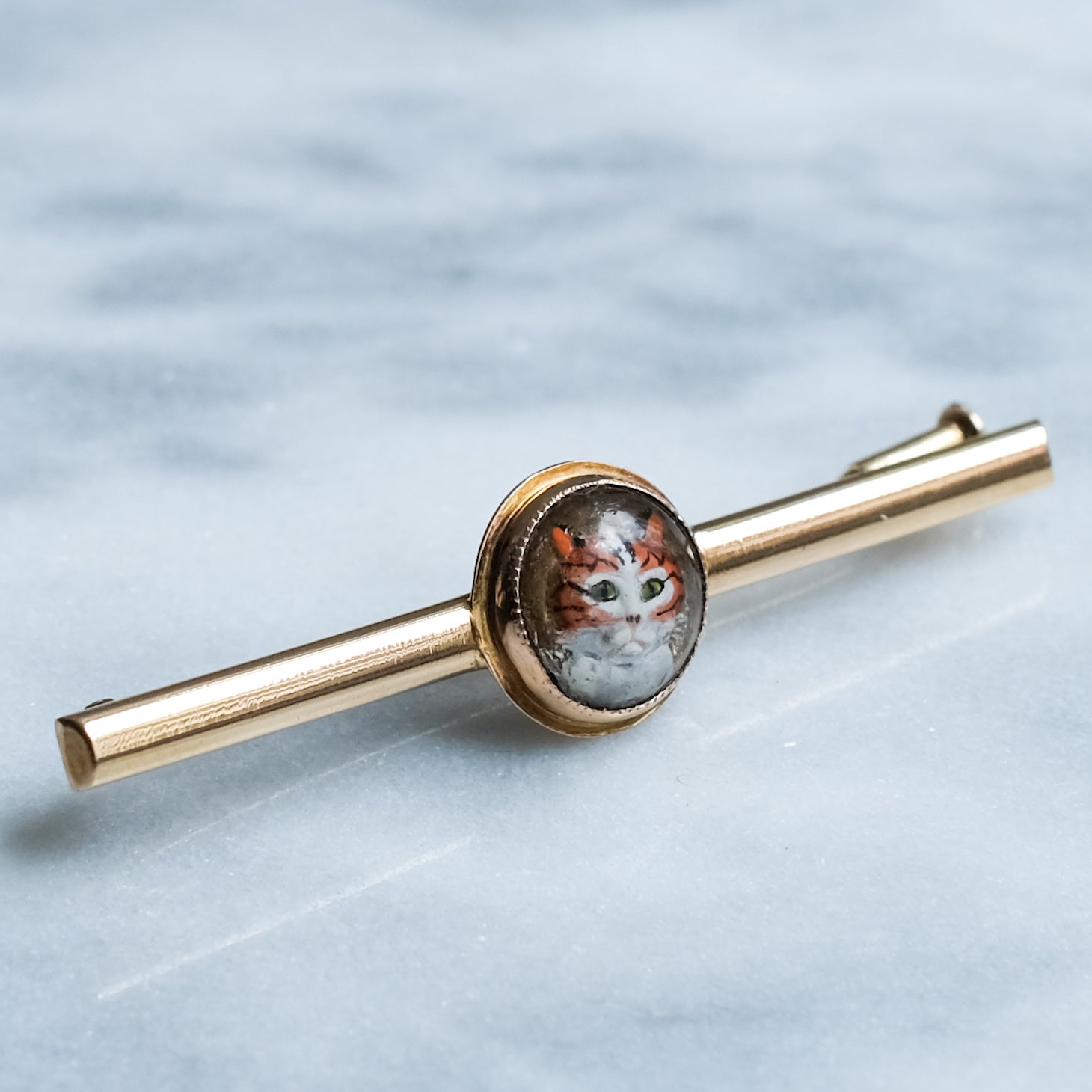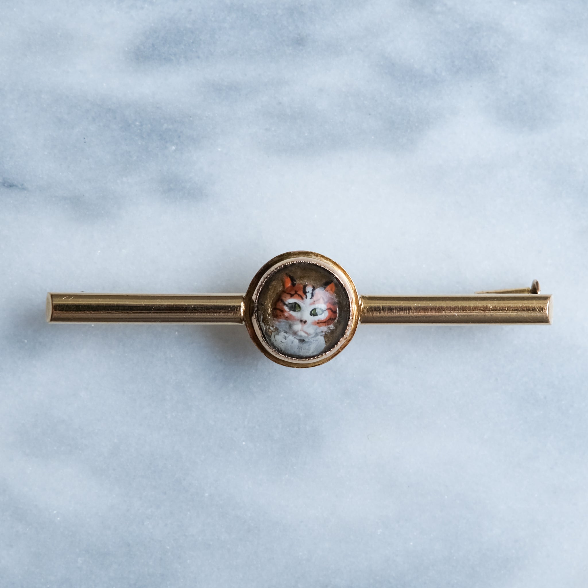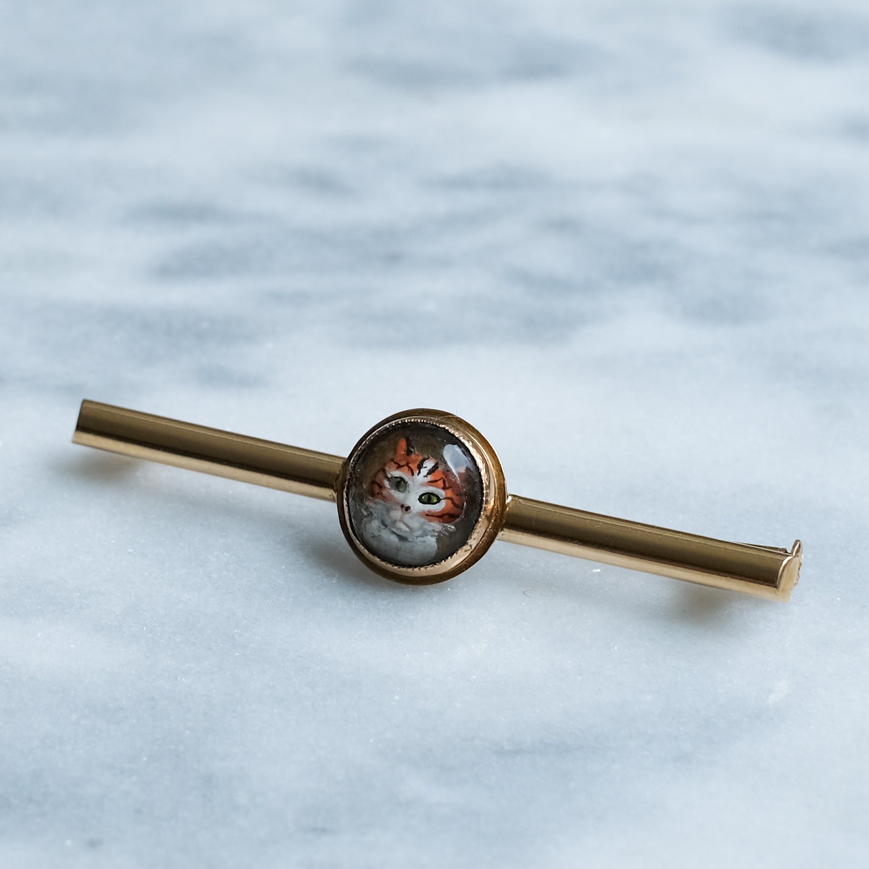 This enchanting brooch is crafted in 18K yellow gold and features a beautifully carved, reverse-intaglio domed crystal depicting a hand-painted ginger cat. Delicately rendered in warm shades of orange and white with black striping and vivid green eyes, the cat’s inquisitive expression brings this charming piece to life. An irresistible addition to any cat-themed jewellery collection.