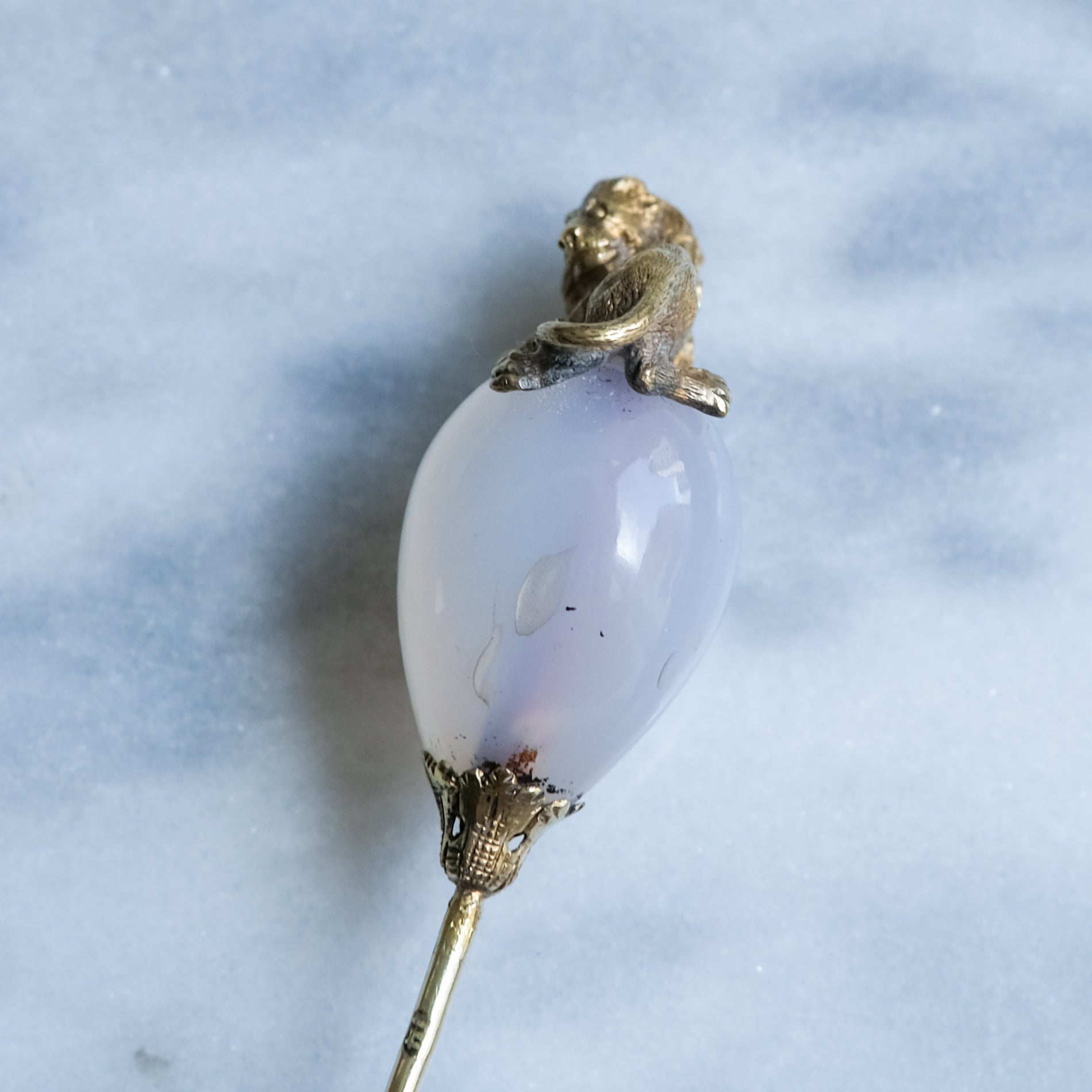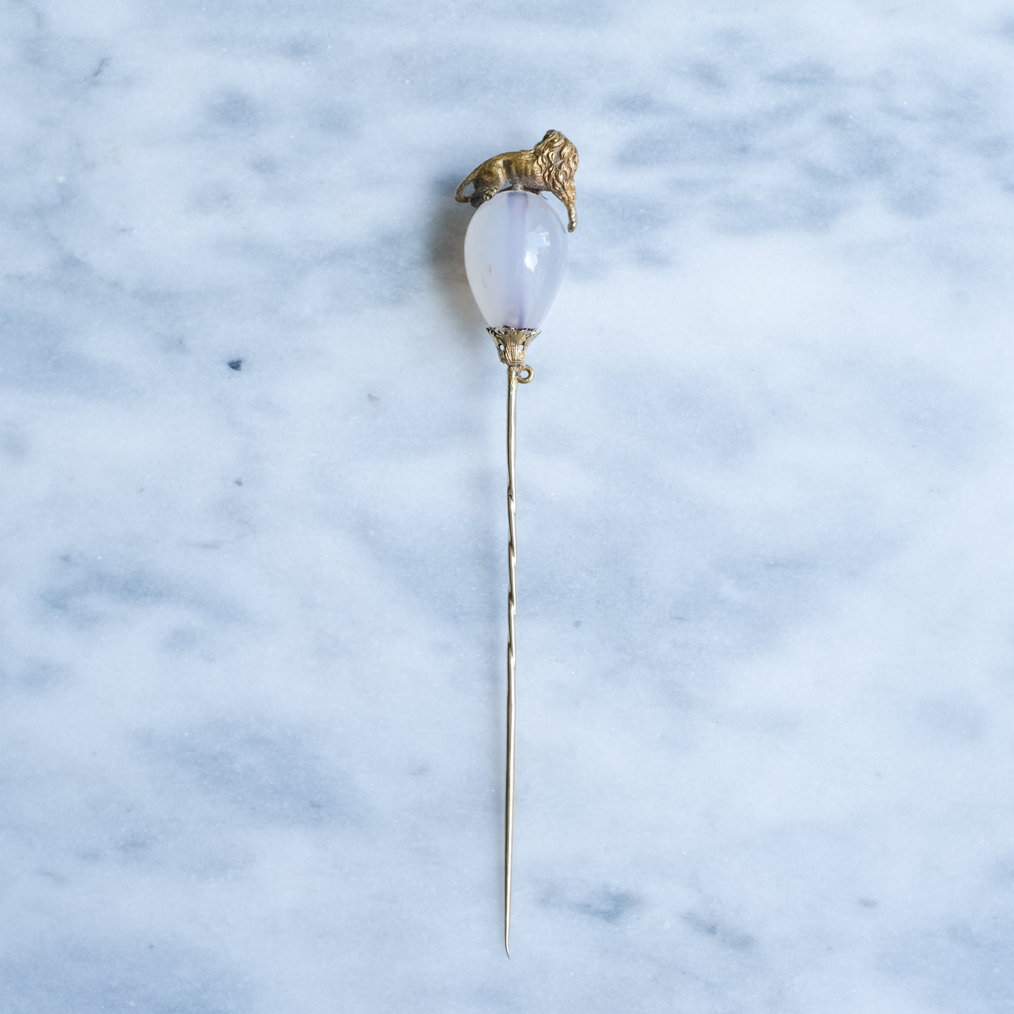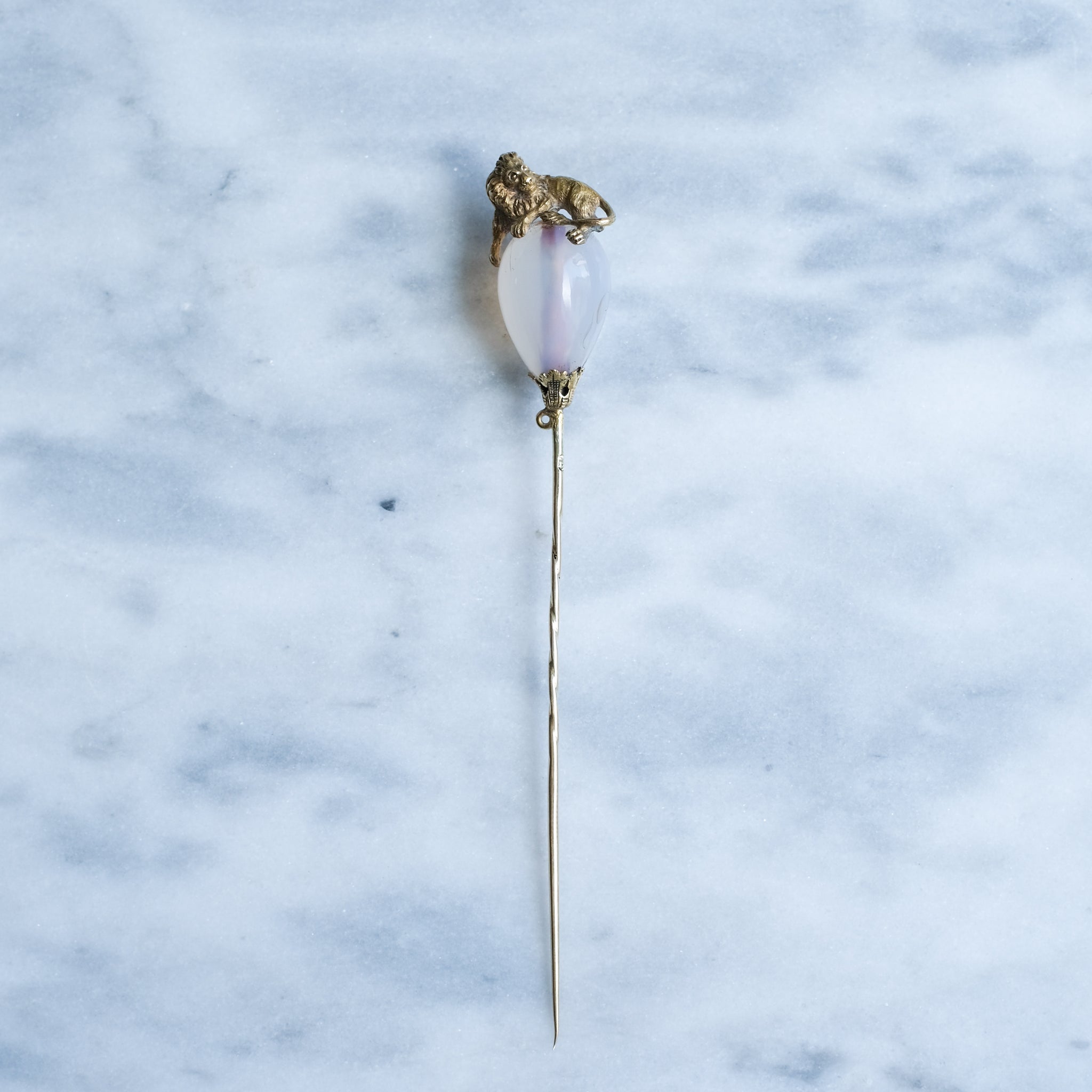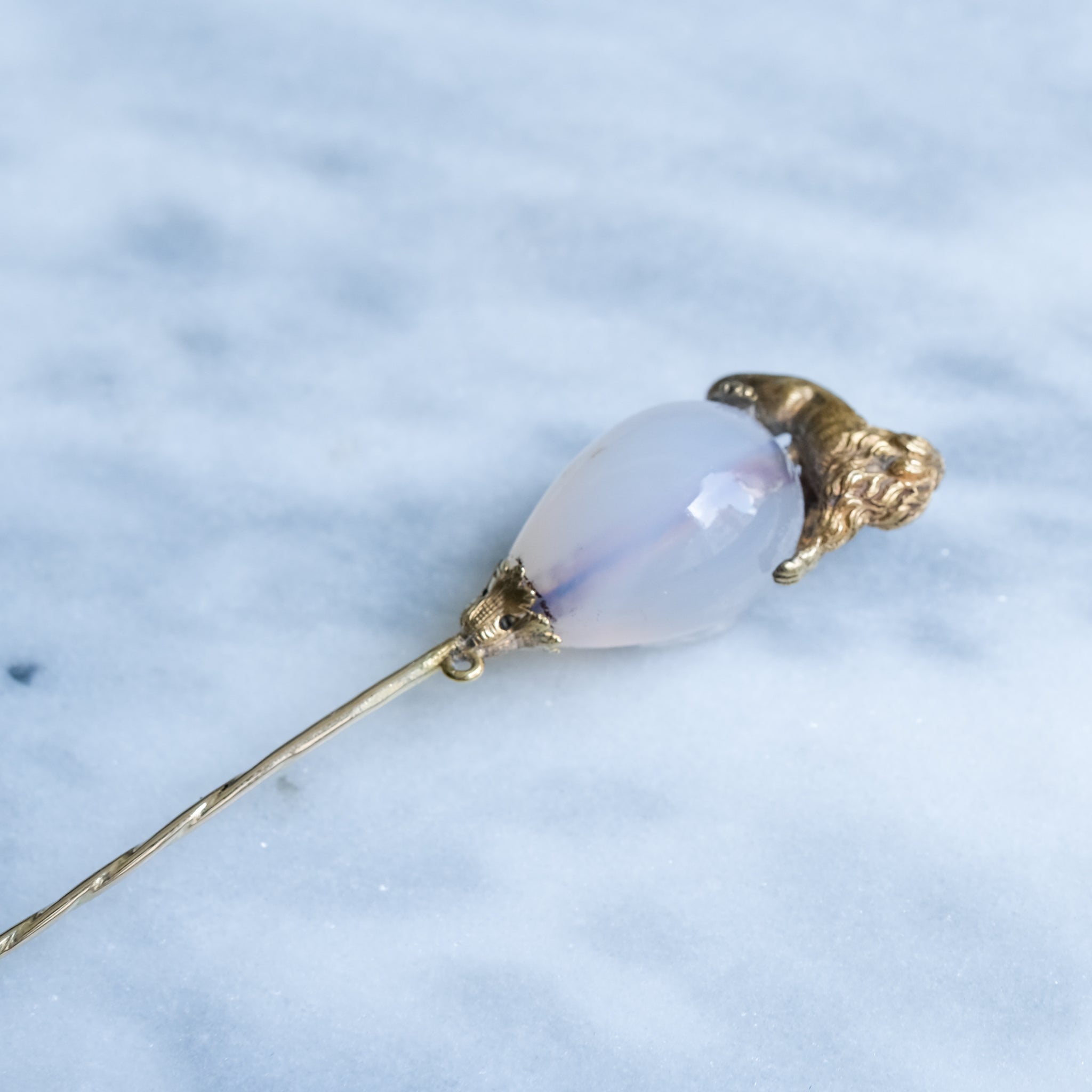 This exquisite antique agate lion stick pin is a true timeless treasure, beautifully crafted in 14K yellow gold. Its striking presence is elevated by the ethereal, milky-white, teardrop-shaped agate that gracefully holds a regal lion that protectively cradles the gemstone, highlighting the gem's pure elegance.