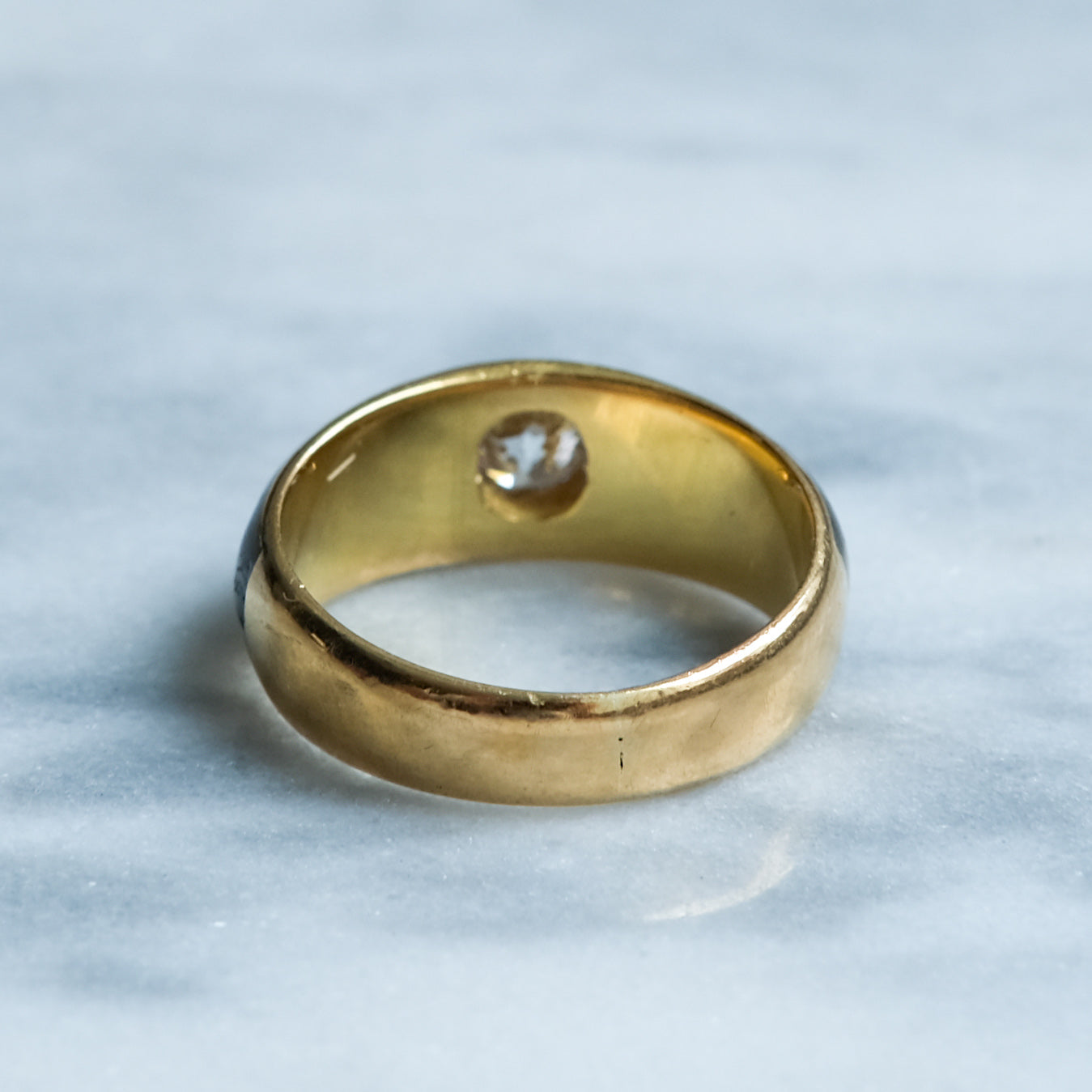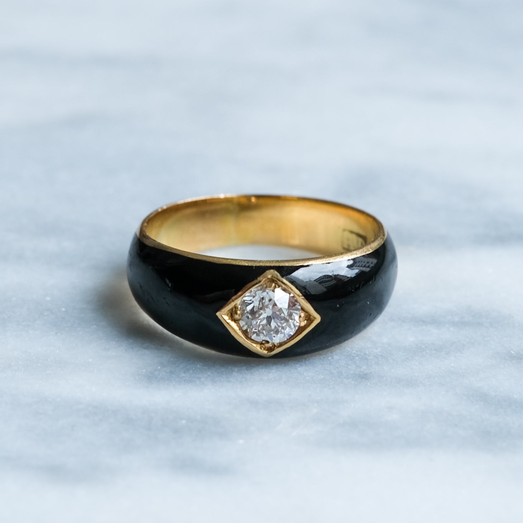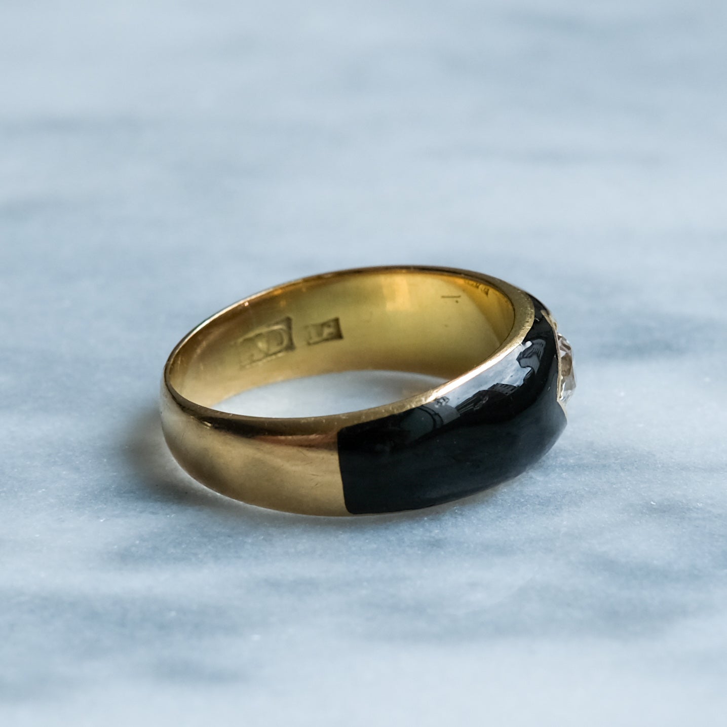 A striking antique Victorian-era ring crafted in 18K yellow gold, adorned with black enamel that extends halfway along the shoulders of the band and centered with a sparkling old European cut diamond, bead-set within a rhombus-shaped mount.